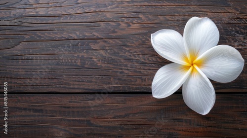 © TheWaterMeloonProjec, Naklejka premium White Plumeria flower on wooden table top view with space for text