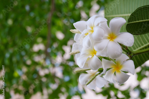 Fototapeta premium White plumeria flowers and refreshing green leaves