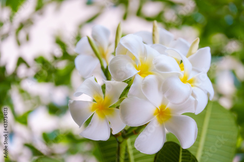 Fototapeta premium White plumeria flowers and refreshing green leaves