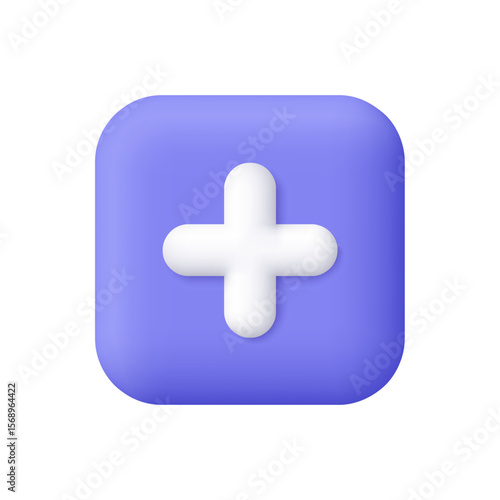 © Анна Тощева, Obraz premium White plus or medical cross on purple square button. 3d vector icon. Cartoon minimal style.
