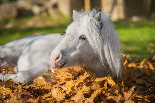 © Rita Kochmarjova, Naklejka premium White pony lying in leaves in autumn