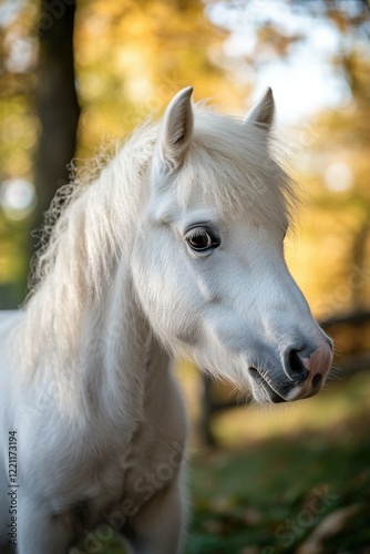 Fototapeta premium White pony with soft mane in autumn forest setting