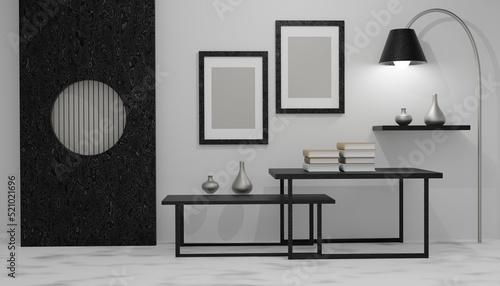 © SkyPark, Obraz premium White poster on cabinet floor with blank frame mockup for you design. Layout mockup good use for your design preview. Mockup poster frame in minimalist modern interior background, 3d render