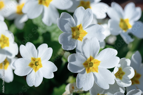 Naklejka premium White Primroses Blooming in Soft Spring Sunlight
