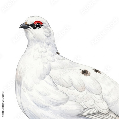 Naklejka premium White Ptarmigan Bird Illustration with Red Eyebrow and Speckled Feathers on White Background