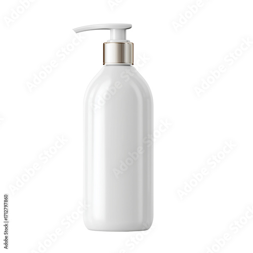 © Barun, Fototapeta premium White pump bottle with ribbed gold collar and white dispenser isolated on a transparent background liquid