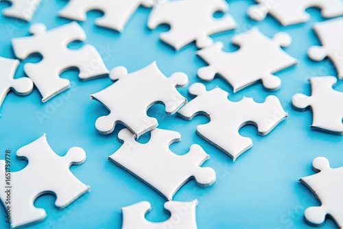 © MARNI, Obraz premium White puzzle pieces on blue background, problem solving concept