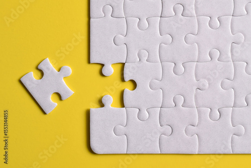 © Mulad Images, Fototapeta premium White puzzle pieces on yellow background. Flat lay. Top view