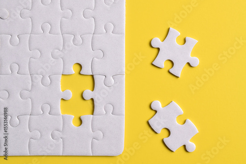 © Mulad Images, Fototapeta premium White puzzle with missing piece on yellow background. Flat lay. Top view