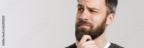 Obraz premium White puzzled man with beard posing and looking aside