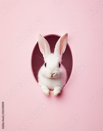 © LELISAT, Obraz premium White Rabbit against Pink Background. Easter concept with copy-space
