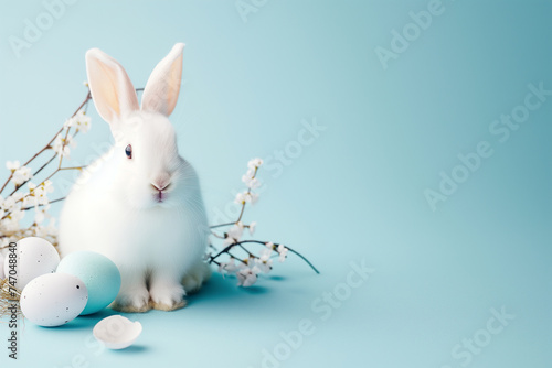 © erika8213, Obraz premium White rabbit and Easter eggs on pastel blue background with copy space.