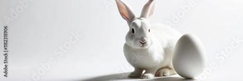 © MonkeyART, Fototapeta premium White rabbit and white egg. Copy space for text Easter banner