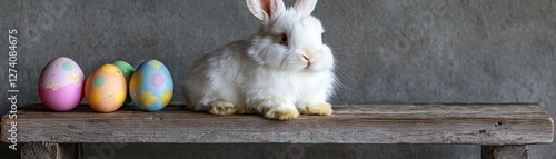 © CreativeLoom, Obraz premium White rabbit beside colorful Easter eggs on a rustic wooden table.