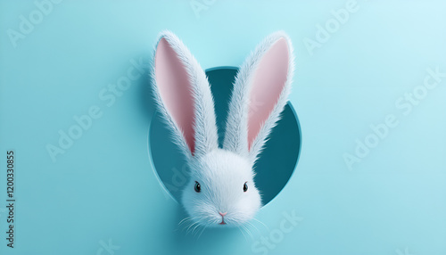 © Oleksiy, Obraz premium White rabbit ear on pastel blue background. Easter day