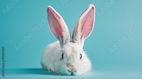Obraz premium White rabbit ears peeking out on a pastel blue background, perfect for an...