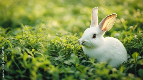 Fototapeta premium White rabbit in green field