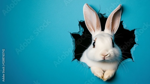 © BrilliantPixels, Obraz premium White Rabbit Peeking Through Torn Turquoise Paper, Easter , Animals