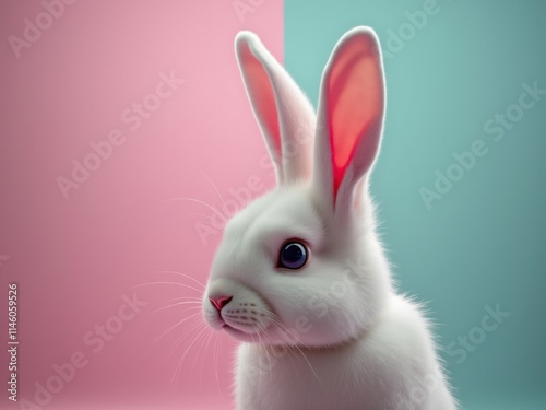 Obraz premium White rabbit posing on pink and turquoise background
