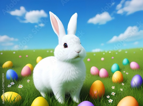 © lesslemon, Fototapeta premium White rabbit sitting in green grass with colorful Easter eggs on green trees and blue sky background, Generative AI