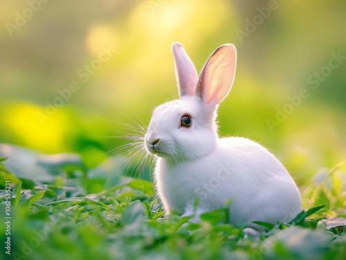 Obraz premium White Rabbit Sitting Peacefully on Green Grass with Soft Natural Blur Background