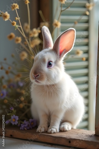 © Joanna, Fototapeta premium White Rabbit Sitting Quietly on Rustic Windowsill with Dried Flowers with Copy Space