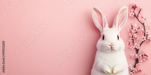 © Chananporn, Obraz premium White rabbit surrounded by pink flowers on a soft pink background in a whimsical scene 100 chars