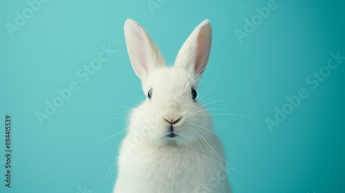 Obraz premium White rabbit with a blue background looking inquisitive.