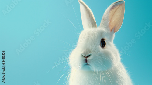 Obraz premium White rabbit with a blue background looking inquisitive.