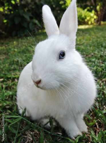 © poco_bw, Fototapeta premium White rabbit with blue eyes in the green grass,