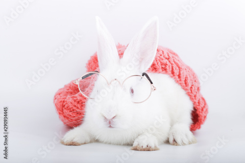 Obraz premium White rabbit with clear eyeglasses with pink yarn hat. Baby bunny on white...