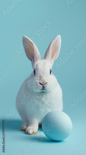 © sunaiart, Obraz premium white rabbit with Easter egg on blue background.Minimal creative EAster party concept.Top view,copy space.Generative AI