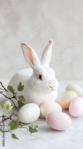 © Emilio, Obraz premium White rabbit with pastel Easter eggs on marble surface. Minimalist spring holiday concept for Easter greeting cards, decorations and festive vertical designs. Celebration background with copy space