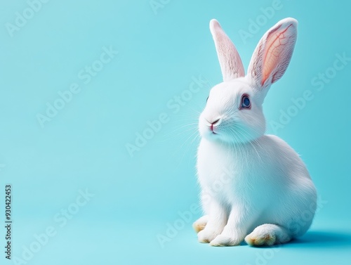 © Amara, Obraz premium White Rabbit with Pink Ears and Blue Eyes on a Turquoise Background A Sideways Glance