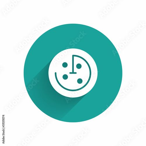 Fototapeta premium White Radar with targets on monitor in searching icon isolated with long shadow background. Search system. Navy sonar. Green circle button. Vector