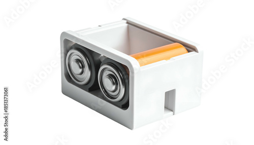 © Nada, Obraz premium White rectangular holder showcasing two inserted batteries and a third orange battery