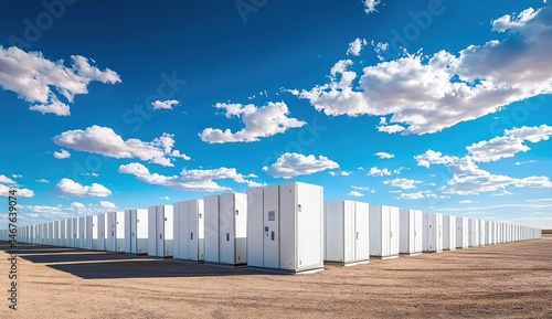 © YONG, Obraz premium White rectangular storage units in a barren landscape under blue sky.