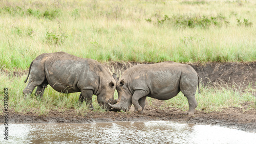 © Matthew, Fototapeta premium White Rhino mother and calf, baby at a waterhole