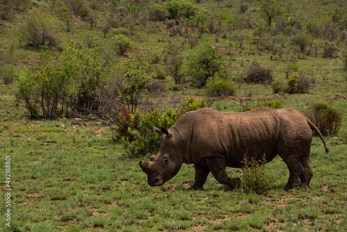 © Hislightrq, Fototapeta premium White rhino walking though the short green grass