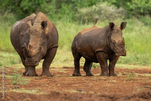 Naklejka premium White Rhinoceros (Ceratotherium simum). Adult and Juvenile Standing in Open...