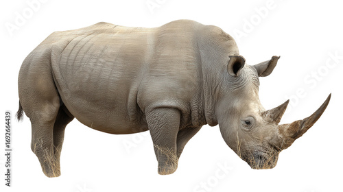 © Athirat, Fototapeta premium White Rhinoceros in the Savanna: A white rhinoceros grazing in the savanna, isolated on a Transparent background, PNG file.