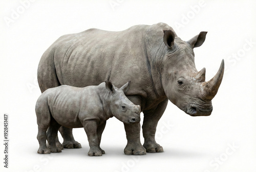 © Vivid_Vision, Obraz premium White rhinoceros mother with cute calf standing on white background