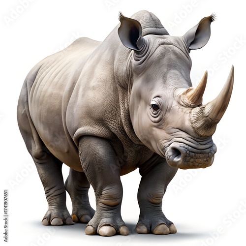 Fototapeta premium White Rhinoceros Standing on White Background Keywords: rhinoceros, rhino,...