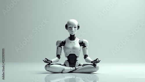 Fototapeta premium white robot doing meditation advanced engineering technological advancement moment of meditation robot's eyes are closed aura of calm minimalist
