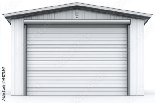© SY, Fototapeta premium White roll-up door on metal building. Perfect for storage, industrial, or commercial projects needing a secure entry.
