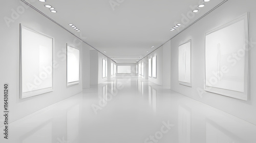© Sahraya, Fototapeta premium White room, corridor background, museum space 3d render. Art gallery, exhibition hall interior with blank white frames hanging on wall, spotlight illumination on ceiling, Realistic vector illustration