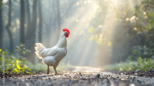 Fototapeta premium White rooster in a sunlit forest path.