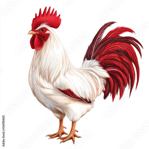 © Napaporn, Fototapeta premium White rooster with vibrant red feathers stands proudly