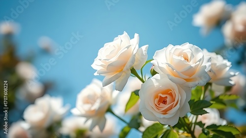 © Ze, Obraz premium White roses against a blue sky with a soft bokeh background in natural sunlight.