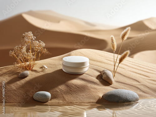 Fototapeta premium White Round Cream Jar on Sandy Dunes